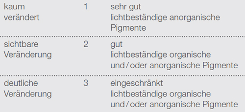 Основой для выбора подходящей комбинации пигментов и вяжущего для покрытий фасадов согласно DIN EN ISO 4618 с декоративными требованиями для наружных поверхностей является Памятка BFS № 26: "Изменения цвета покрытий на наружных поверхностях", изданной Федеральным комитетом по лакокрасочным и защитным покрытиям (BFS). В документе ожидаемые изменения цвета покрытий классифицируются с помощью кода светостойкости.
