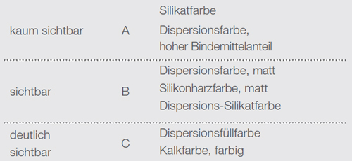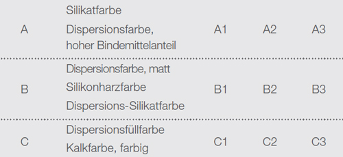 Согласно Памятке BFS № 26 типы вяжущих различают по их склонности к мелению. Классификация по мелению производится непосредственно для общеупотребительных типов вяжущих, например, силикатная краска или силиконовая краска. Наряду с непосредственной классификацией согласно Памятке BFS № 26 существует возможность самостоятельной классификации производителя, например, в случае вяжущих, которые еще не включены в памятку или имеют специальные свойства. В целом для фасада действительно следующее: А лучше В, В лучше С.